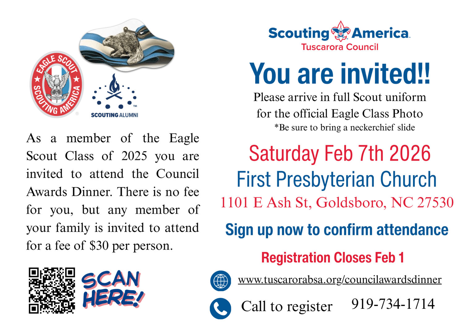 Attire: Eagle Scout are asked to arrive in full Scout unform for a group photo. It is also recommended they bring a neckerchief slide. All Scout Volunteers and family members may attend in their uniform or an something for a formal meal.